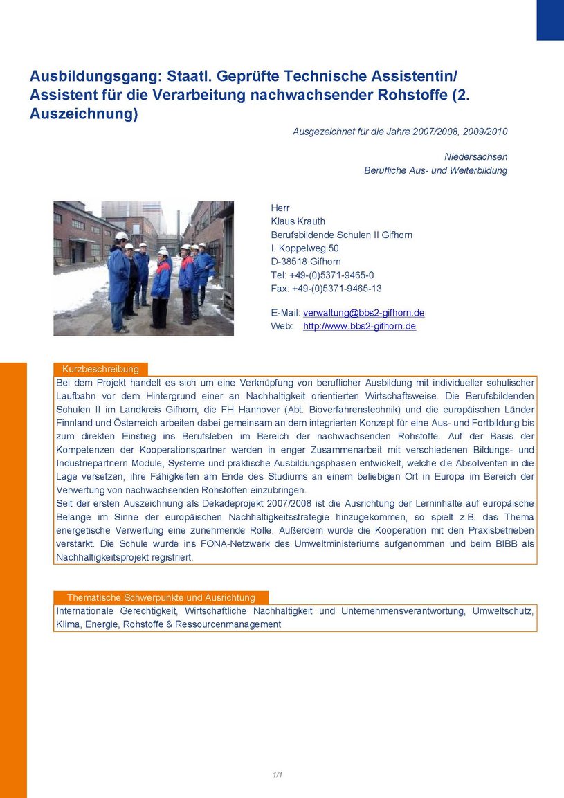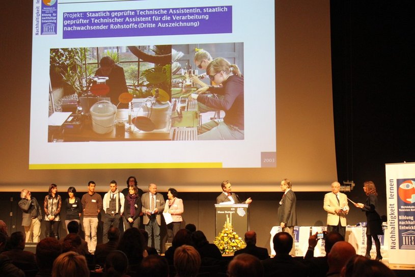 Der Ausbildungsgang "NaWaRo" erhielt zum zweiten Mal die Auszeichnung als UNO-Dekade-Projekt für 2009 - 2010. Die Auszeichnung wurde im Maharadscha-Saal des Zoos Hannover von Prof. Dr. de Haan überrreicht. Den Preis nahmen Carsten Melchert, die Schülerin Lena Wunderlich und der Schüler Hannes Pabst entgegen.