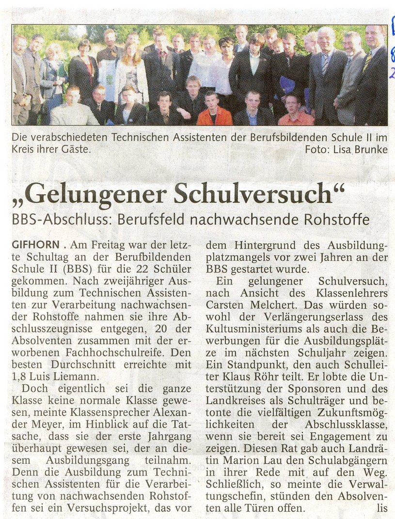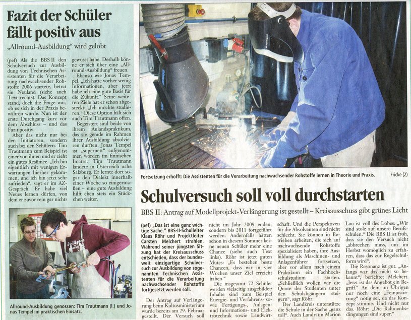 Beginn und Ablauf des Schulversuchs: Seit dem Schuljahr 2006/07 wurden in einem ersten Durchgang 24 Schülerinnen und Schüler auf die Fachhochschulreife und den Abschluss als Technischer Assistent für die Verarbeitung nachwachsender Rohstoffe vorbereitet. Von 24 Schülerinnen und Schülern haben 22 den Abschluss Technische(r) Assistent/in errreicht. 20 haben den schulischen Teil der Fachhochschulreife abgeschlossen und können nach einem 1/2jährigen Anerkennungsspraktikum ein Fachhochschulstudium aufnehmen. In den Jahren 2008 -10 haben von 72 angefangenen Schülerinnen und Schülern 65 das Ausbildungsziel erreicht. 59 von Ihnen haben den schulischen Teil der FH-Reife bestanden. Neue Schulklasse 2010/11