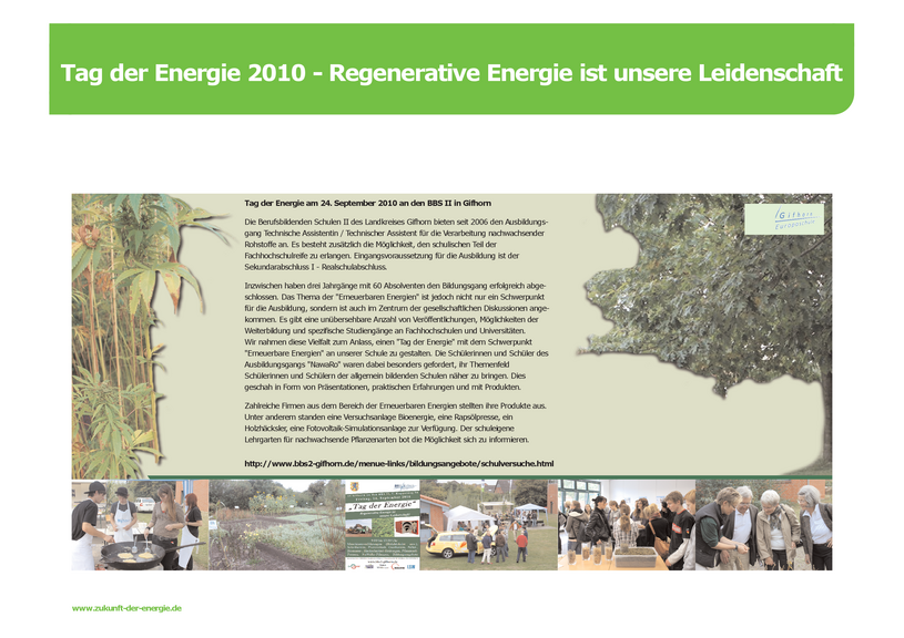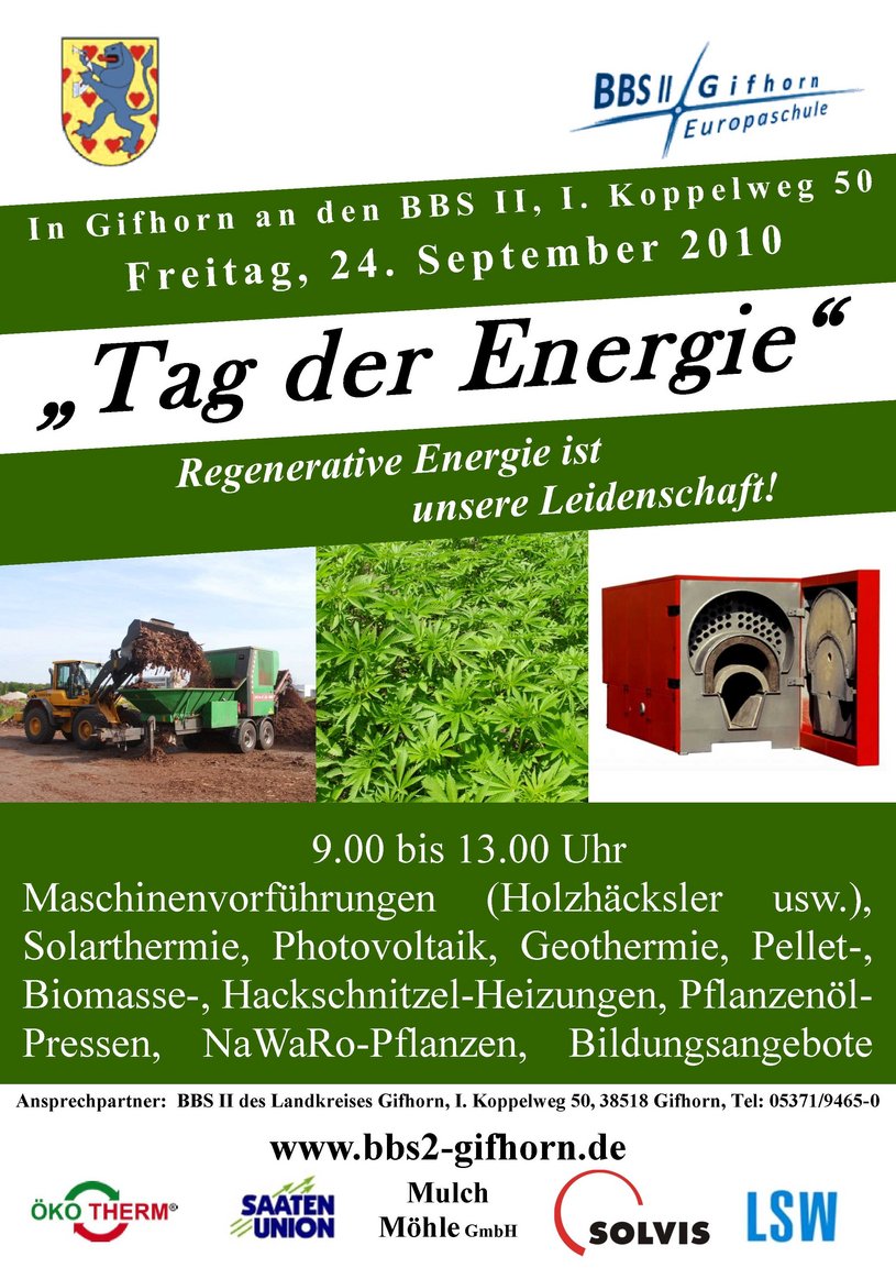 Wissenschaftsjahr Zukunft der Energie 2010: Wir haben im Rahmen des Themenjahres "Zukunft der Energie" des BMBF mit einem "Tag der Energie - Erneuerbare Energien" am 24. September an den BBS II in Gifhorn teilgenommen. Bei der Abschlussveranstaltung am 16.12.2010 in Berlin war unser Beitrag in einer Ausstellung der Einzige von fast 60 Beiträgen, die von einer Berufsschule kommen.