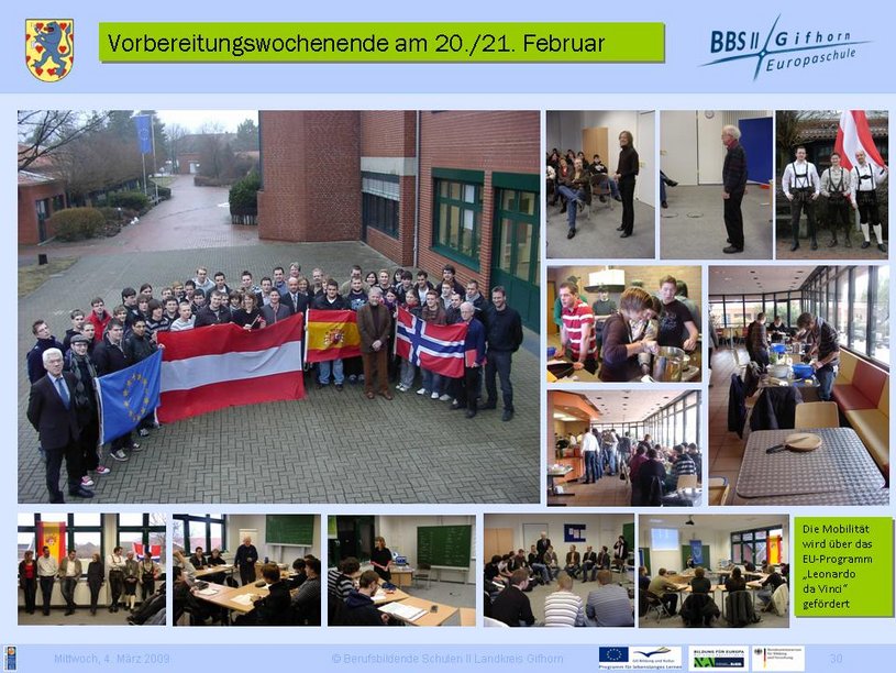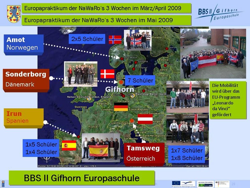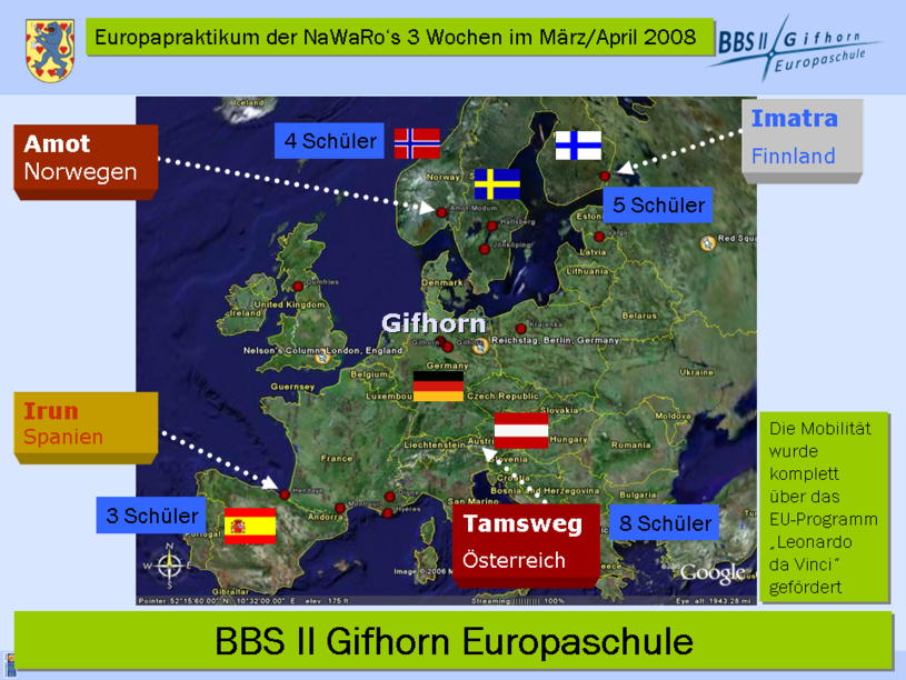 EU-Praktikum im Rahmen von Leonardo da Vinci - Mobilität: Im März / April 2008 konnten die ersten Schülerinnen und Schüler in Norwegen, Finnland, Schweden, Österreich und Spanien drei Wochen in Betrieben ihr Praktikum absolvieren. Für dieses Engagement erhielten sie den Europass. In den Folgejahren konnten weitere Schülerinnen und Schüler ein EU-Praktikum erfolgreich abschließen. Insgesamt sind es in den Jahren 2008-2010 65 Schülerinnen und Schüler. Die Finanzierung konnte über das Leonardo da Vinci Mobilitätsprogramm der EU sichergestellt werden. Wir sind den Steuerzahlern in der EU und dem EU-Parlament sehr zu Dank verpflichtet, dass sie uns diese Möglichkeit eröffnet haben.