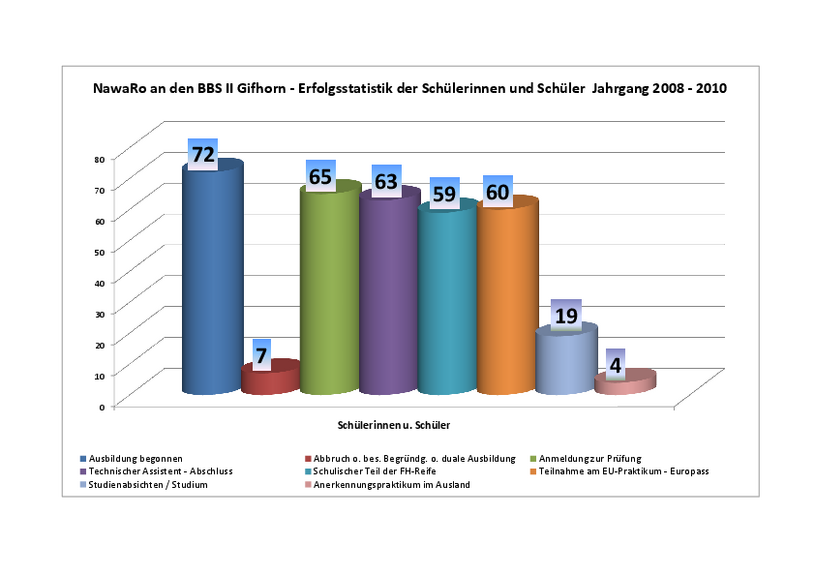 Beginn und Ablauf des Schulversuchs: Seit dem Schuljahr 2006/07 wurden in einem ersten Durchgang 24 Schülerinnen und Schüler auf die Fachhochschulreife und den Abschluss als Technischer Assistent für die Verarbeitung nachwachsender Rohstoffe vorbereitet. Von 24 Schülerinnen und Schülern haben 22 den Abschluss Technische(r) Assistent/in errreicht. 20 haben den schulischen Teil der Fachhochschulreife abgeschlossen und können nach einem 1/2jährigen Anerkennungsspraktikum ein Fachhochschulstudium aufnehmen. In den Jahren 2008 -10 haben von 72 angefangenen Schülerinnen und Schülern 65  das Ausbildungsziel erreicht. 59 von Ihnen haben den schulischen Teil der FH-Reife bestanden. Neue Schulklasse 2010/11