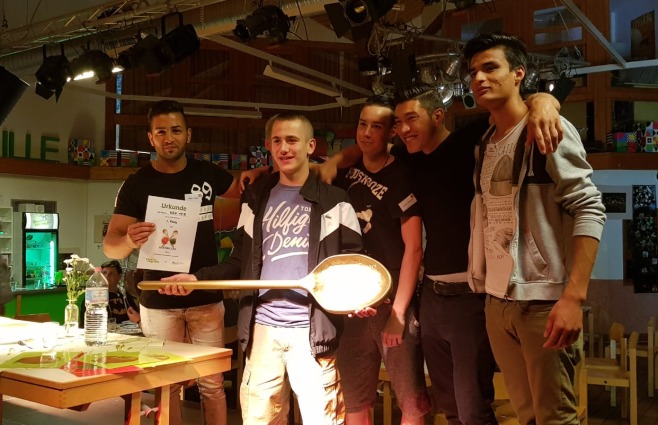Bewertet wurden die eigens kreierten 3 Gänge Menüs beider Gruppen zu dem Motto "Alles Käse". Die Jury bestand aus unserem Schulleiter Herrn Melchert, den Chefkoch des Gifhorner Schlossrestaurants Herrn Zentgraf und Frau Sommer als Vertretung der KVHS in Gifhorn. Ermöglicht wurde das Projekt durch Herrn Knöfel, Filialleiter von Famila, der die Lebensmittel spendete und die KVHS, sowie das FBZ Grille die für Räumlichkeiten und Unterstützung sorgten. Gewinner der Herzen sind beide Klassen, den goldenen Kochlöffel erhielten die Jungs der Bau Klasse.